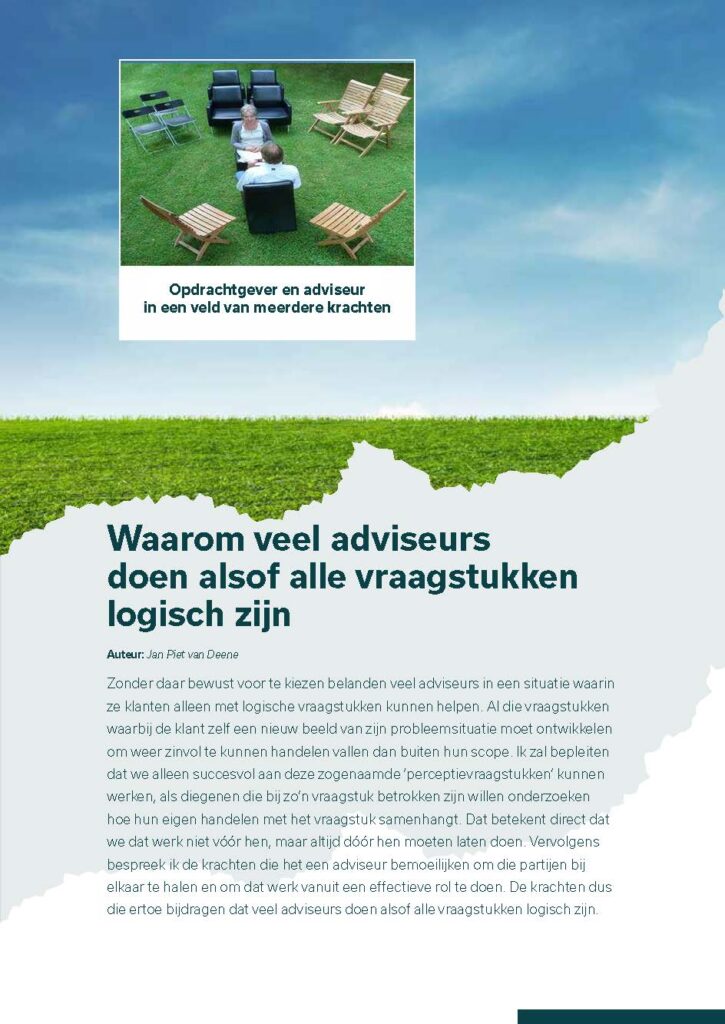 Zonder daar bewust voor te kiezen belanden veel adviseurs in een situatie waarin ze klanten alleen met logische vraagstukken kunnen helpen. Al die vraagstukken waarbij de klant zelf een nieuw beeld van zijn probleemsituatie moet ontwikkelen om weer zinvol te kunnen handelen vallen dan buiten hun scope.